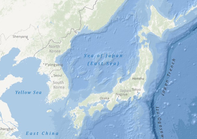 ¹Ì±¹ ±â»óû Á¤º¸ ¼¾ÅÍ NOAA(National Geophysical Data Center) Bathymetry Data Viewer¿¡¼ µ¿Çظ¦ Japan Sea ( East Sea ) ¶ó°í Ç¥±â Çϰí ÀÖ½À´Ï´Ù.