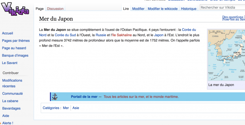 8»ì¿¡¼ 13»ì »çÀÌÀÇ ¾î¸°À̸¦ À§ÇÑ ÀÎÅÍ³Ý ¹é°ú»çÀü »çÀÌÆ®, 'Vikidia'¿¡ µ¿Çظ¦ 'Mer du japon'À̶ó°í À߸ø Ç¥±âÇÔ.