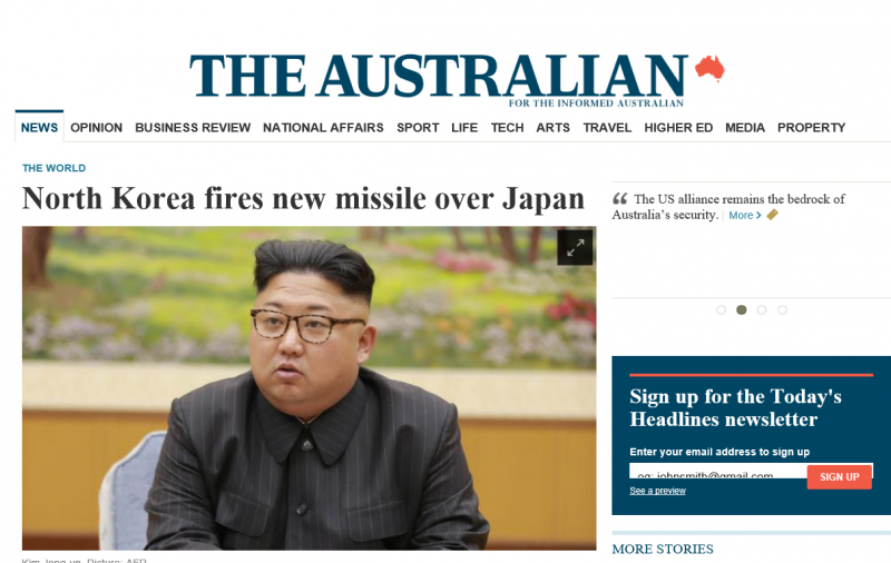 À¥»çÀÌÆ® : http://www.theaustralian.com.au/news/world/north-korea-fires-missile-toward-sea-of-japan/news-story/3e5b762a2ad7345eff3fe9b4217fa62f