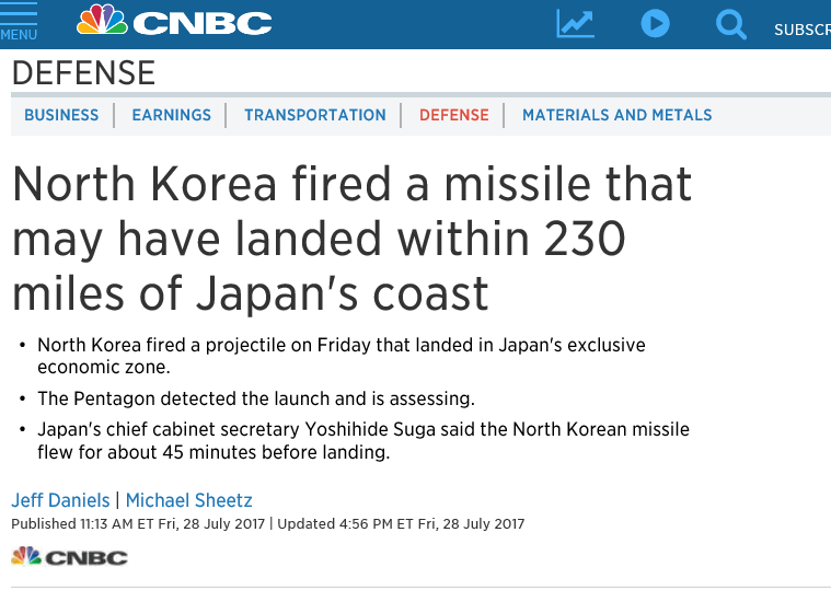 The east sea ¸¦ Japan's exclusive area ¶ó°í Ç¥±âÇÔÀ¥»çÀÌÆ® : https://www.cnbc.com/2017/07/28/north-korea-appears-to-have-fired-another-missile-reuters.html