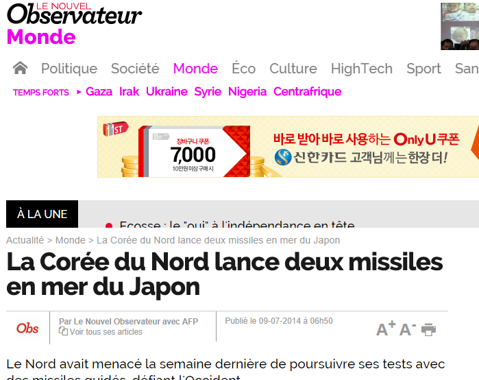 ¸µÅ© :http://tempsreel.nouvelobs.com/monde/20140709.OBS3130/la-coree-du-nord-lance-deux-missiles-en-mer-du-japon.html