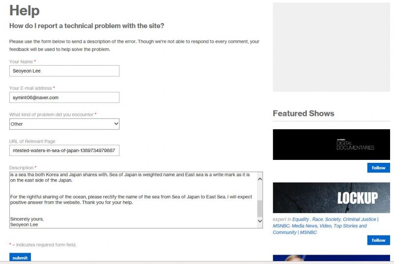 Dear webmaster, This is Seoyeon Lee, a middle school student, from South Korea. I wrote this letter to inform you that the map, linked below, has a mistake. https://www.msnbc.com/msnbc/watch/navy-sails-guided-missile-destroyer-near-russia-contested-waters-in-sea-of-japan-1389734979887